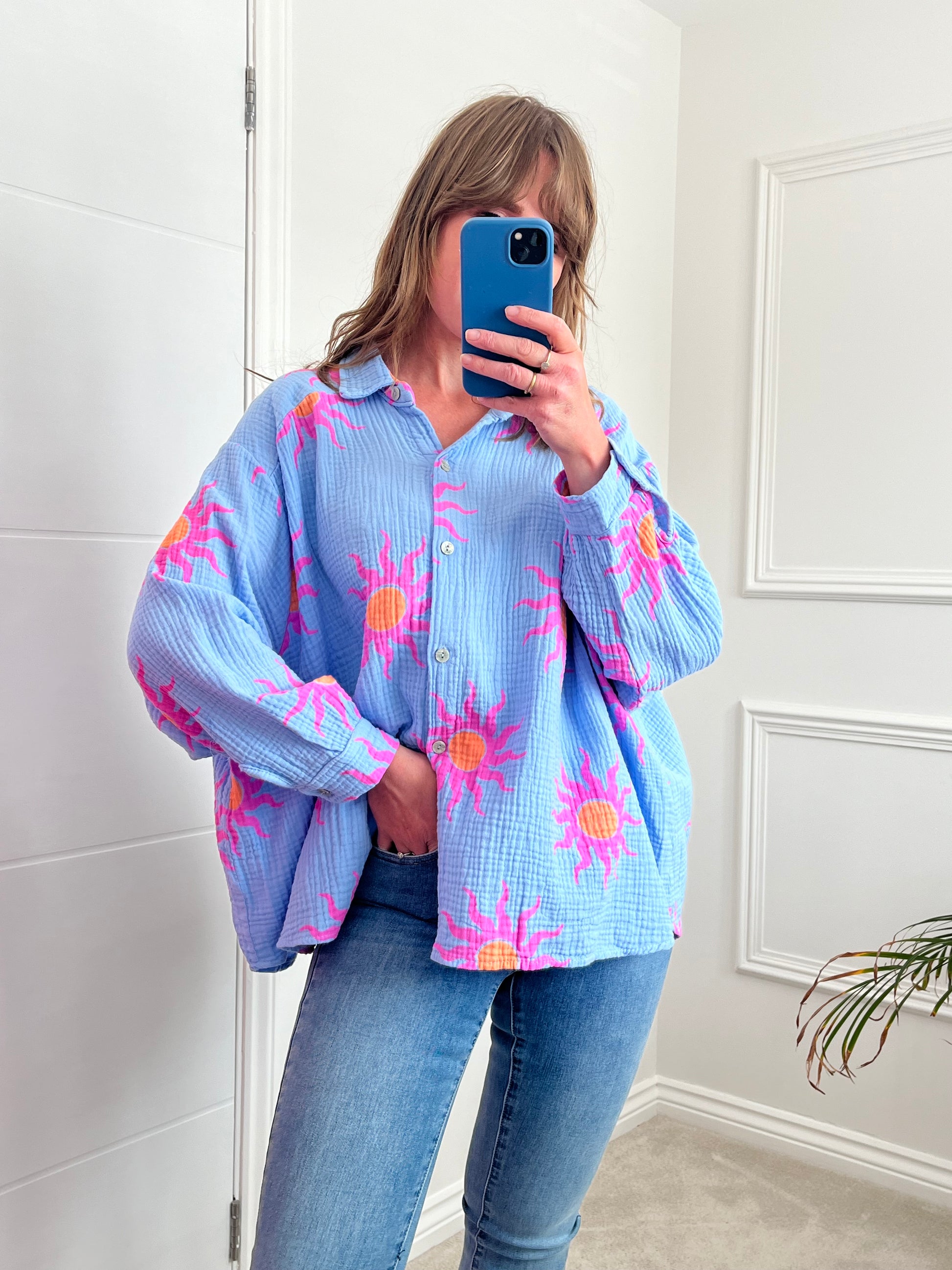 One size fits UK 8 - 16. Oversized loose fitting shirt with button front and sun print.